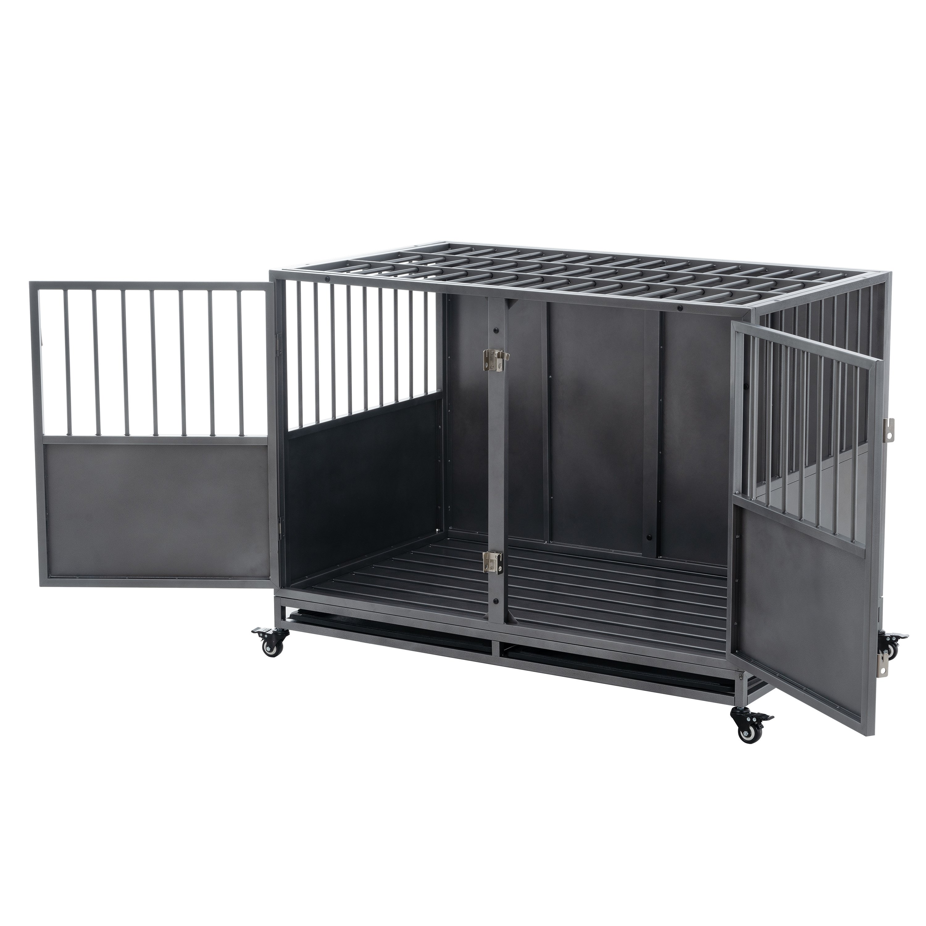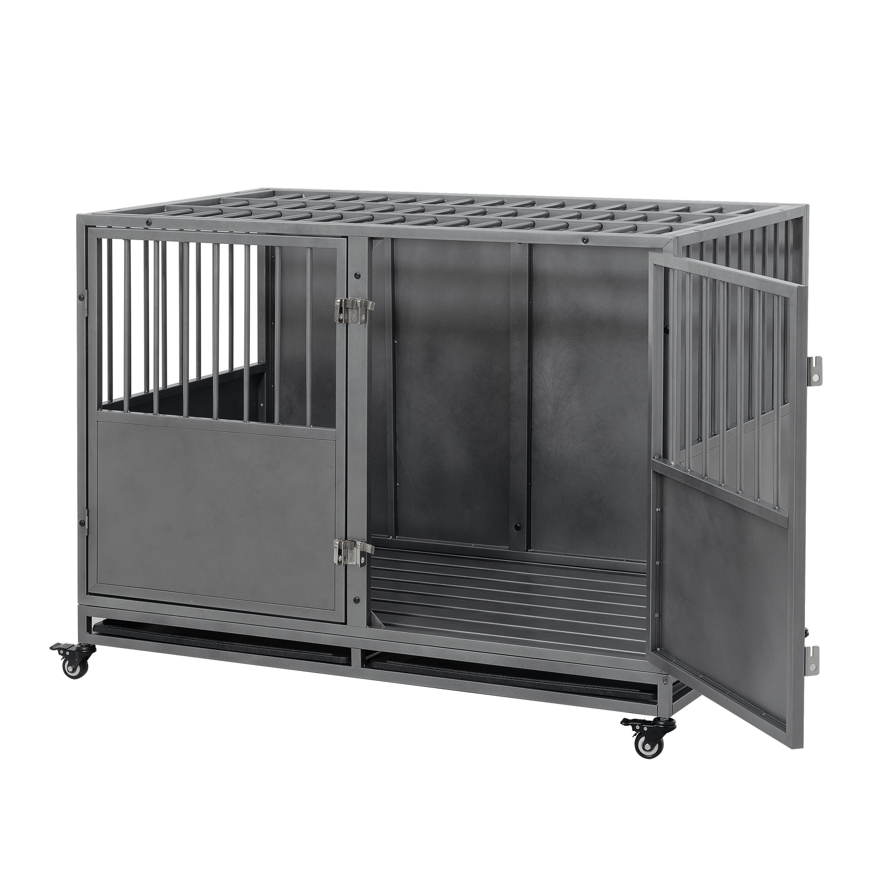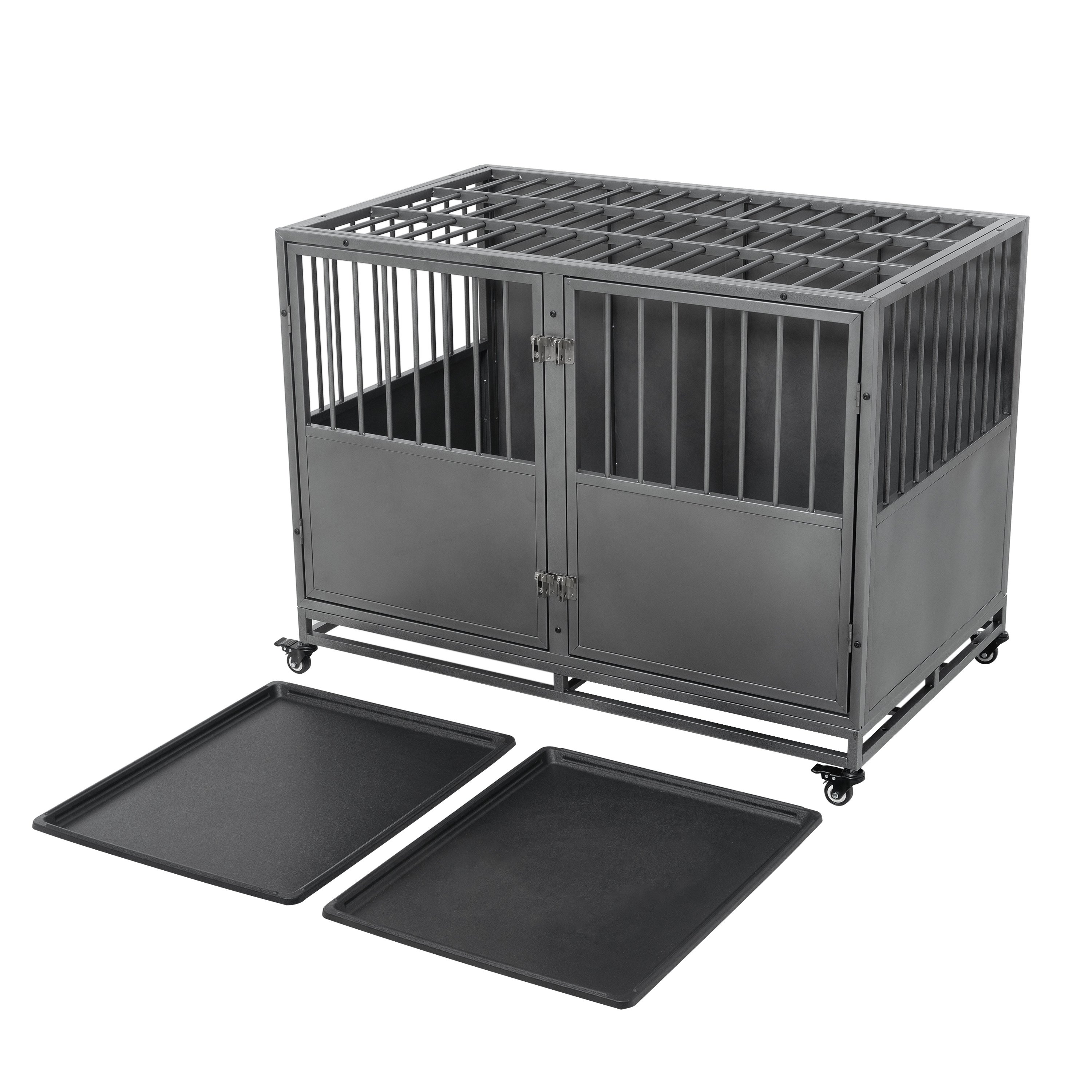 Feasures:Sturdy: Our dog crates features 10 mm diameter metal pipes that effectively prevent chewing, ensuring durability and avoiding deformation. The heavy-duty frame construction combines square tubing and metal sheet, providing your pet with a long-lasting, stable, and safe resting place. Ventilation & Privacy: The spacious interior provides maximum comfort for your beloved companion. The open metal bars allow for visibility and optimal wind flow, preventing overheating. The metal sheet helps your dog experience inner peace of mind, avoiding any feeling of confinement while enjoying a well-ventilated environment.Backside Screened: keep you pet away from the wall when you place the crate close to the wallpaper or wallboard.Double Door Style: There are two doors in front side, you can open one or both for your needs, and also you can divide the crate space when the dog is just a puppy.Size:Overall Size: 47.2inch X 28.7inch X 35.4inchDoor Size: 27.7inch X 21.6inchLock: 4 locks, each door with 2 locks.Tray Size: 27.9inch X 22.1inchWheels: 4 wheel, every wheel lockable.