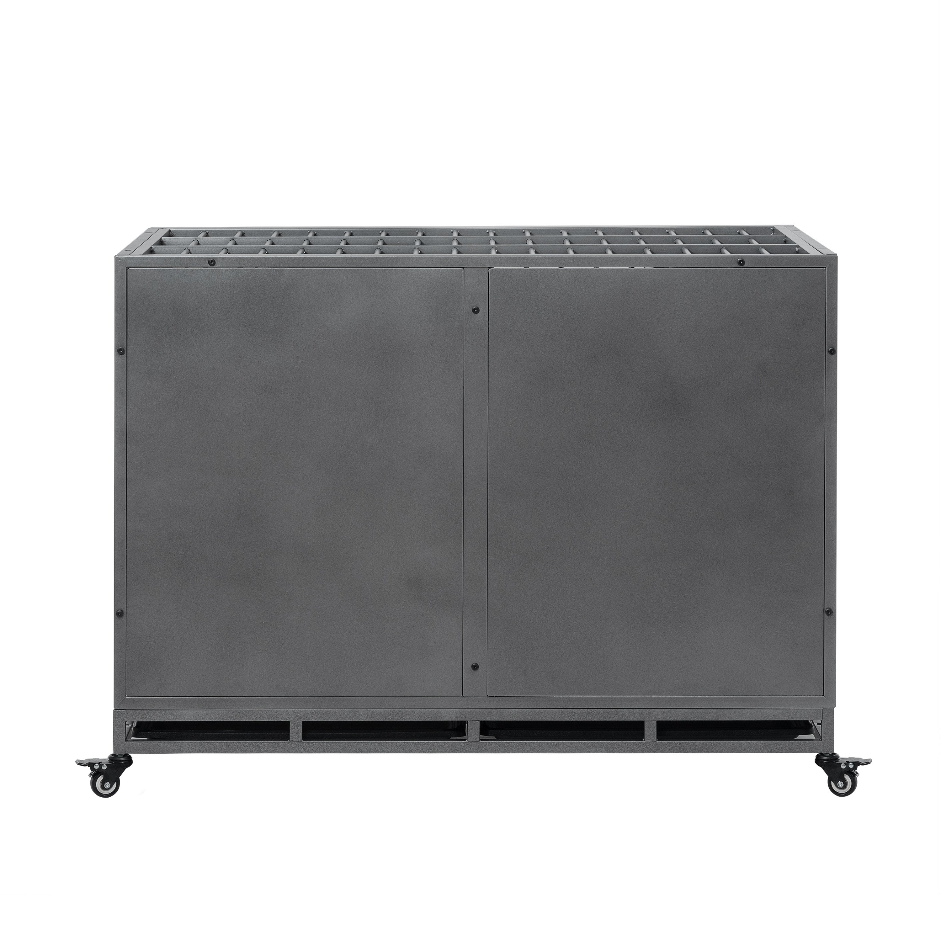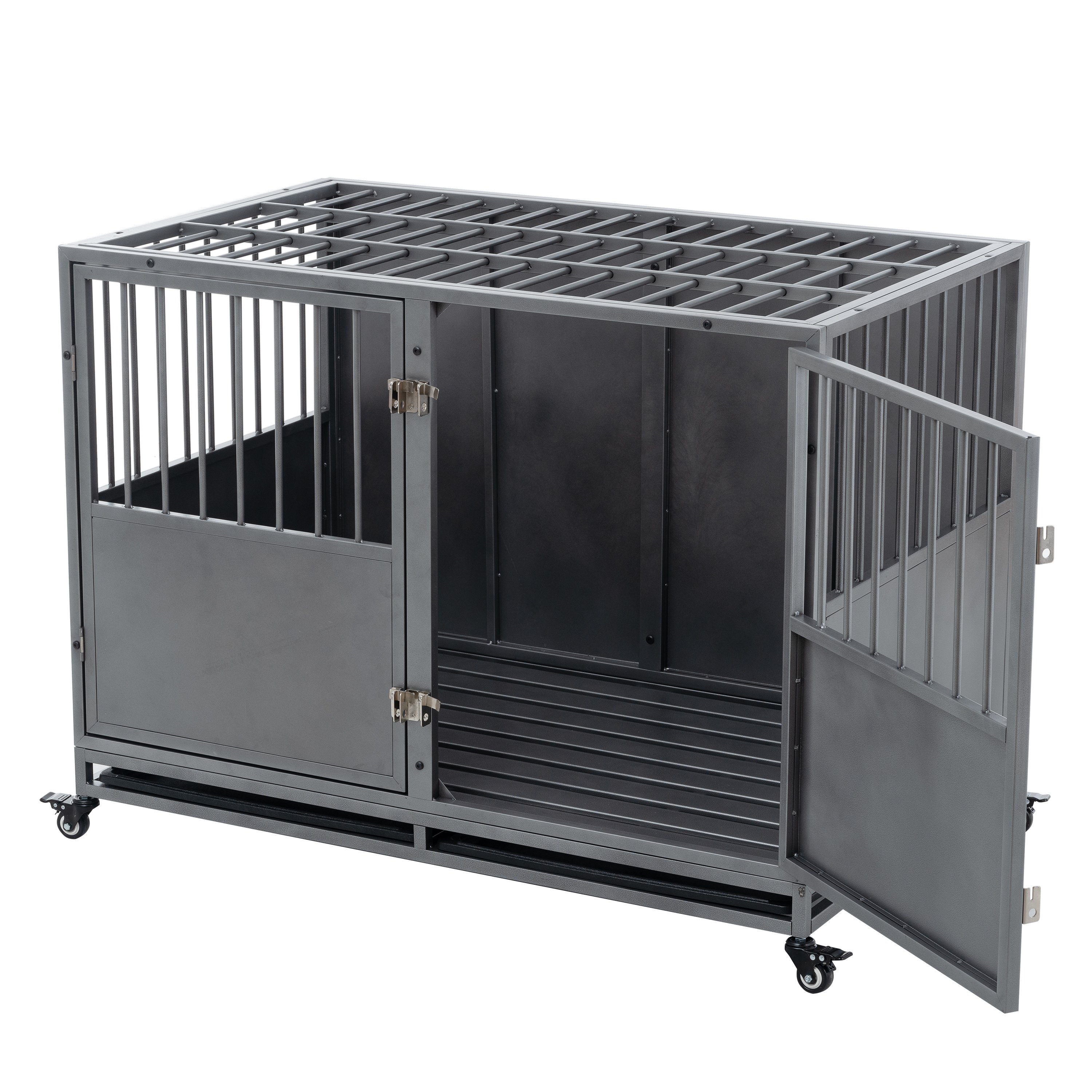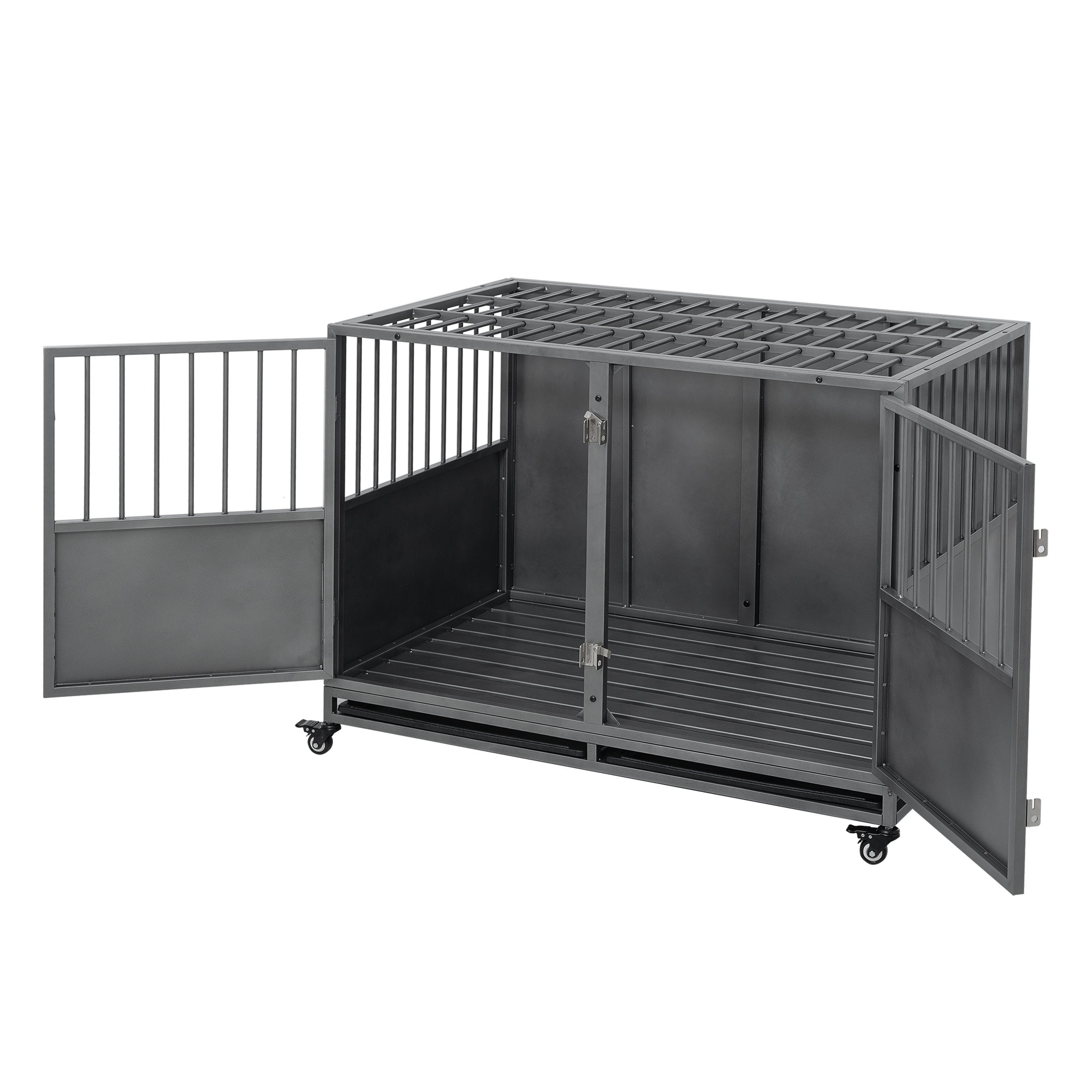 Feasures:Sturdy: Our dog crates features 10 mm diameter metal pipes that effectively prevent chewing, ensuring durability and avoiding deformation. The heavy-duty frame construction combines square tubing and metal sheet, providing your pet with a long-lasting, stable, and safe resting place. Ventilation & Privacy: The spacious interior provides maximum comfort for your beloved companion. The open metal bars allow for visibility and optimal wind flow, preventing overheating. The metal sheet helps your dog experience inner peace of mind, avoiding any feeling of confinement while enjoying a well-ventilated environment.Backside Screened: keep you pet away from the wall when you place the crate close to the wallpaper or wallboard.Double Door Style: There are two doors in front side, you can open one or both for your needs, and also you can divide the crate space when the dog is just a puppy.Size:Overall Size: 47.2inch X 28.7inch X 35.4inchDoor Size: 27.7inch X 21.6inchLock: 4 locks, each door with 2 locks.Tray Size: 27.9inch X 22.1inchWheels: 4 wheel, every wheel lockable.