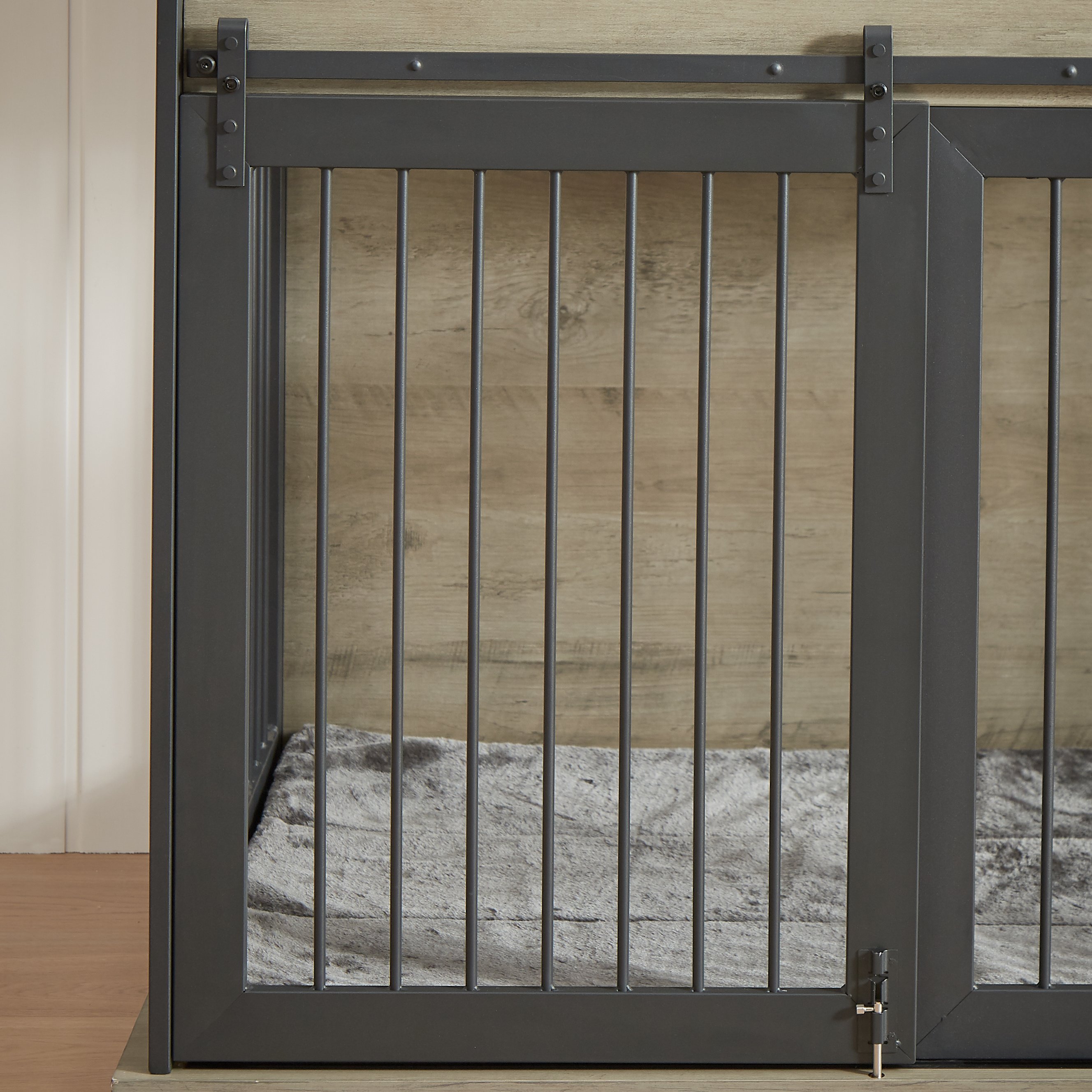 Heavy iron doors give an industrial feel, are stronger, more stable, and prevent your furry friend from chewing on the door frame.