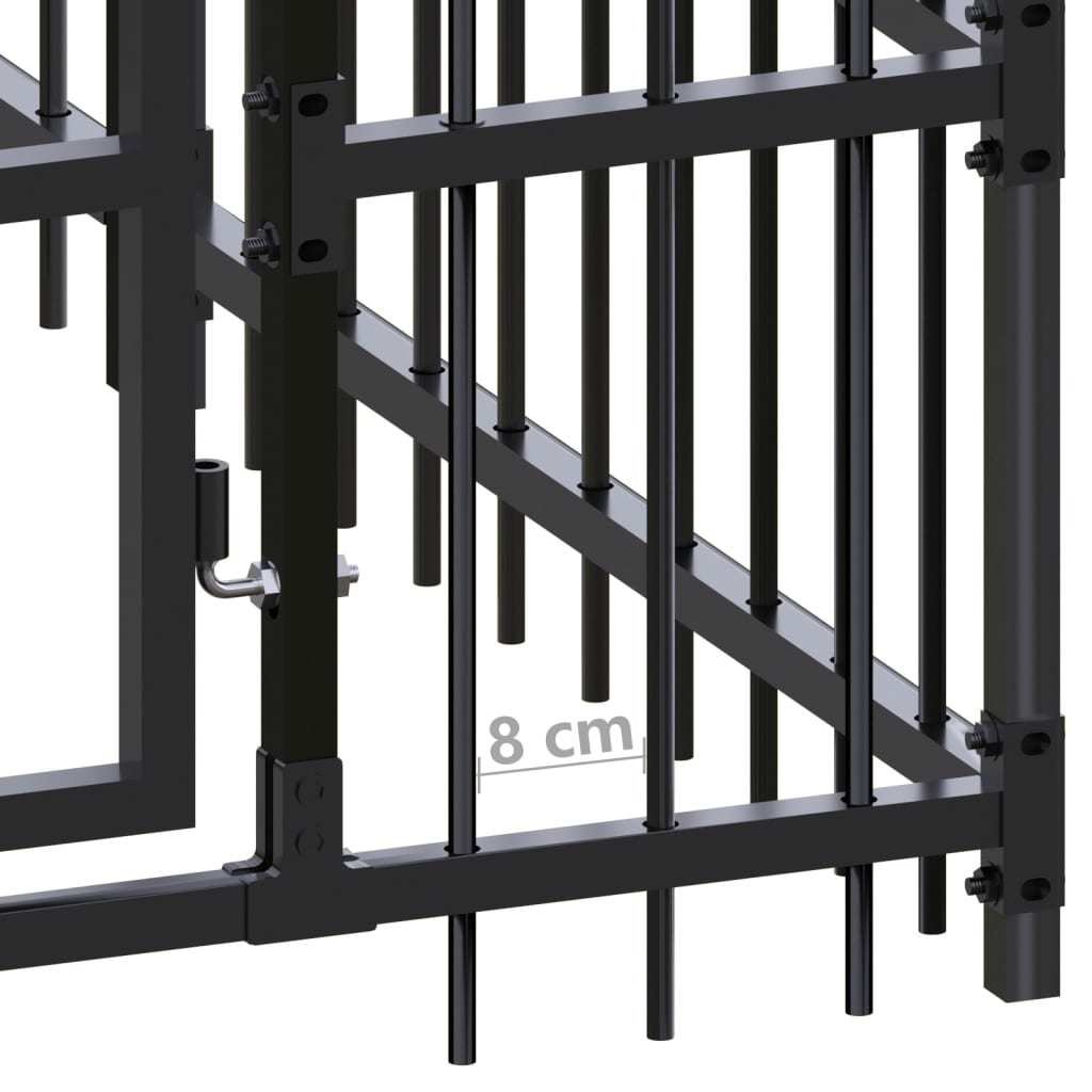 This dog kennel provides ample exercise space. The walls of steel bars help prevent mischief and unexpected accidents while enabling ventilation. Thanks to the sturdy powder-coated steel construction, this dog kennel is durable and built to last. The roof provides protection from sun, rain, snow, as well as other weather conditions. The hinged door with a lockable latch system ensures extra security and safety for your dogs.Color: BlackMaterial: Powder-coated steelOverall dimensions: 78.3" x 78.7" x 89.8" (L x W x H)Door size: 19.7" x 70.9" (W x H)With doors and roofLockable latch systemAssembly required: Yes